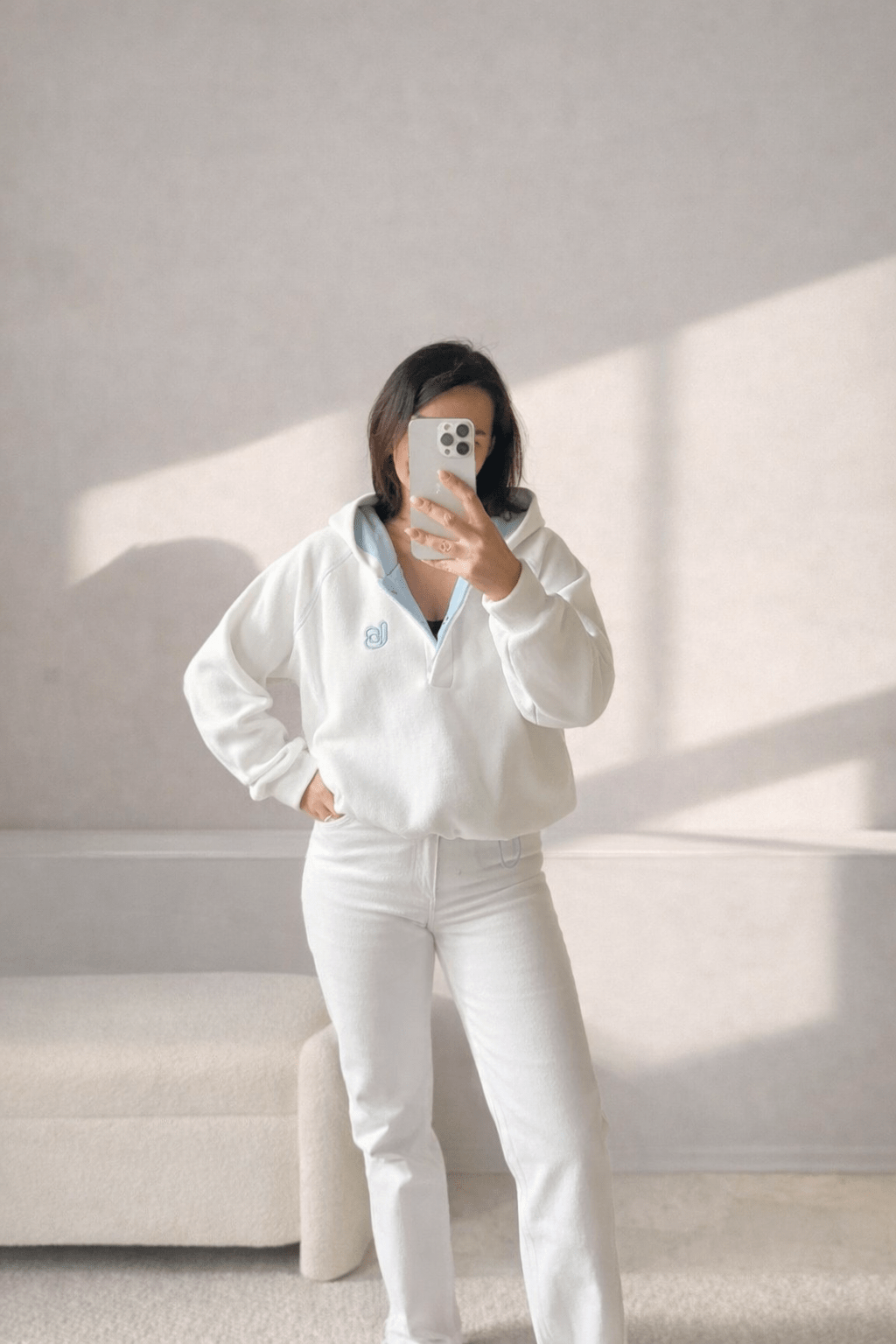 Το Φούτερ Fleece στην καθαρή εκρού απόχρωση με τις δροσερές γαλάζιες λεπτομέρειες είναι η  απάντηση στο μοντέρνο street style.