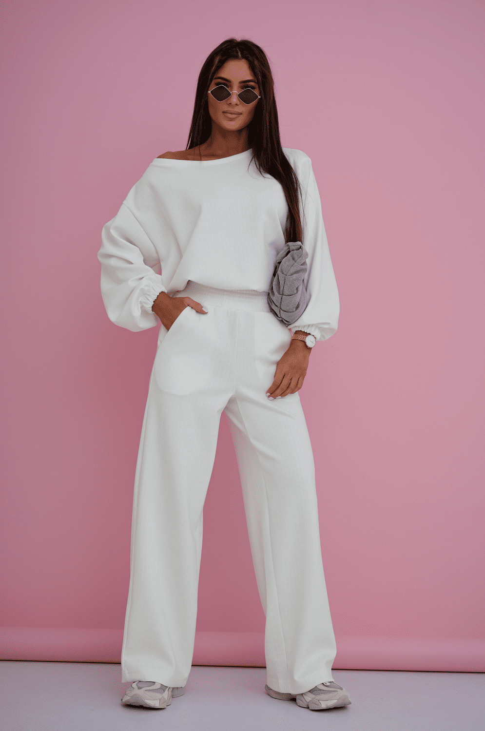Το γυναικείο σετ Comfy στην εκλεπτυσμένη εκρού απόχρωση αποτελεί τον ορισμό του high-end streetwear, φέρνοντας την αισθητική των διεθνών fashion editorials στην καθημερινότητά σας. Το σύνολο αποτελείται από ένα oversized φούτερ με statement drop shoulders και μια αέρινη παντελόνα που δημιουργεί μια επιβλητική σιλουέτα με κίνηση και ύψος. Η ανάγλυφη πλέξη του υφάσματος προσδίδει μια πολυτελή, αρχιτεκτονική δομή στο ρούχο, καθιστώντας το την απόλυτη επιλογή για τη γυναίκα που επιδιώκει ένα look γεμάτο αυτοπεποίθηση και quiet luxury αύρα.
