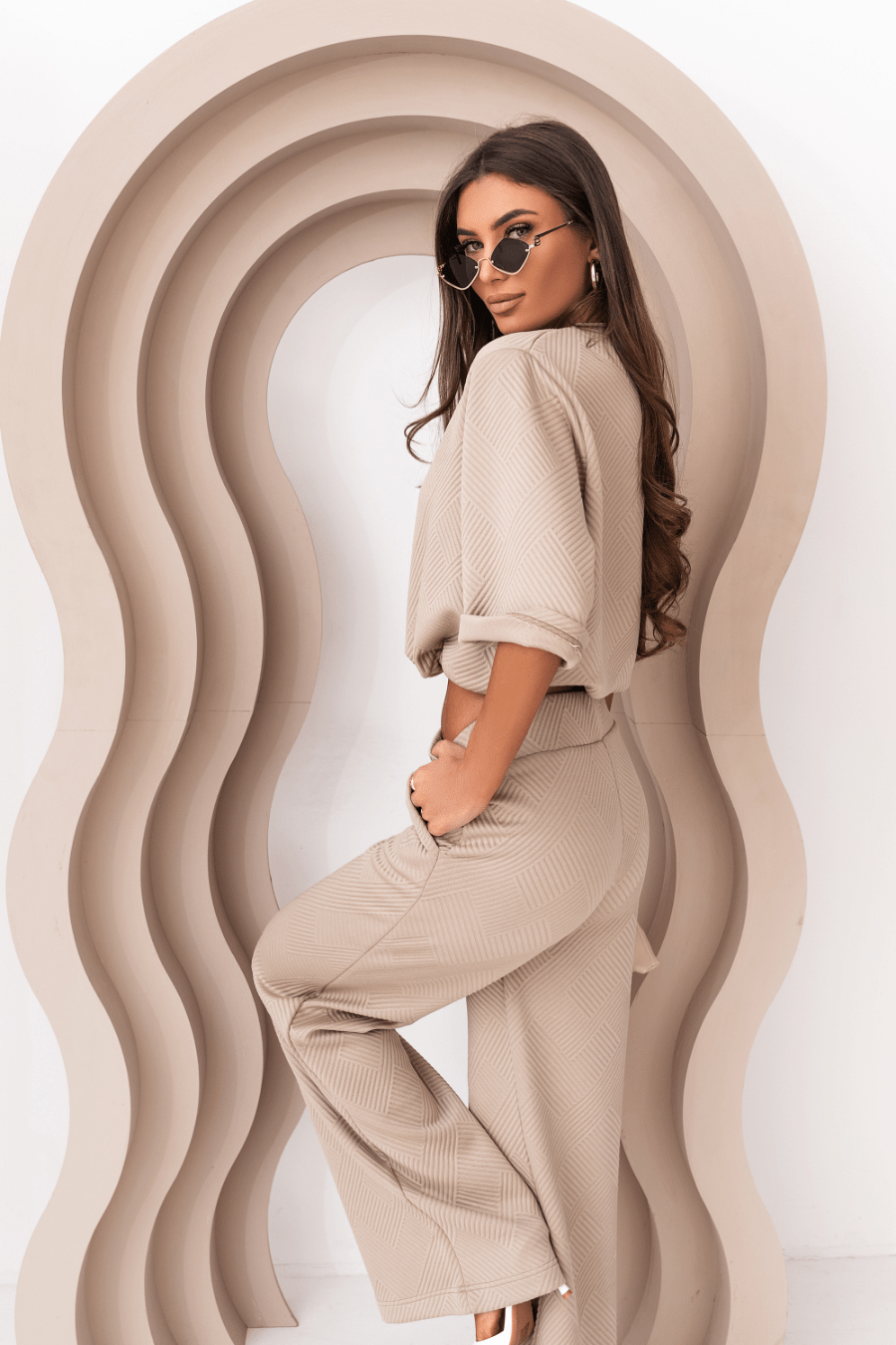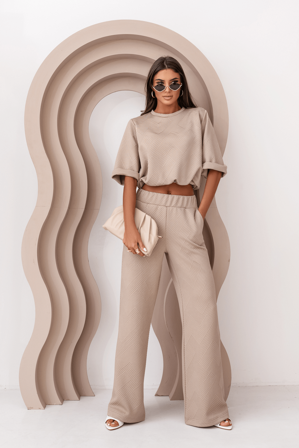 Προσθέστε χρυσούς κρίκους και δαχτυλίδια που θα αναδείξουν το ανάγλυφο μοτίβο του υφάσματος. Ολοκληρώστε την εμφάνιση με λευκά sneakers για urban στυλ ή με περιποιημένα loafers για πιο κλασικό αποτέλεσμα. Το Σετ Laurel Μπεζ είναι σχεδιασμένο για τη γυναίκα που αγαπά την ποιότητα και τις καθαρές γραμμές.
